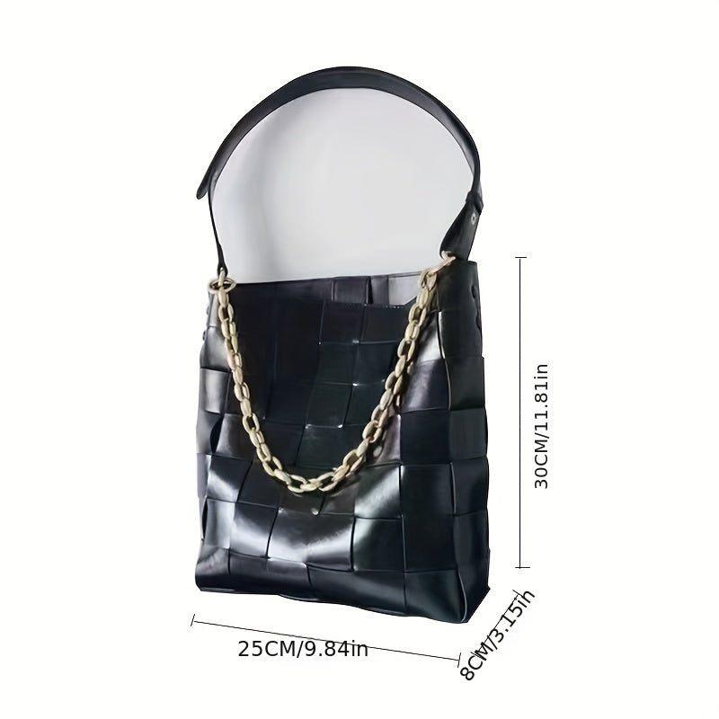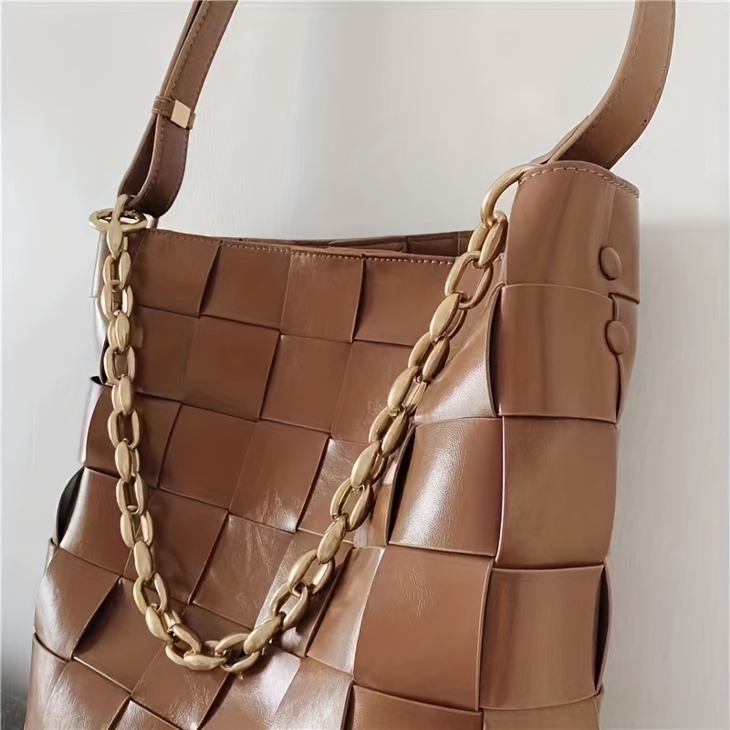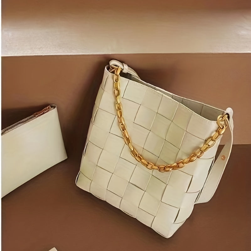 2点セット 編み込みバケットバッグ 大容量 ショルダーバッグ チェーン付き インナーポーチ ハンドバッグ