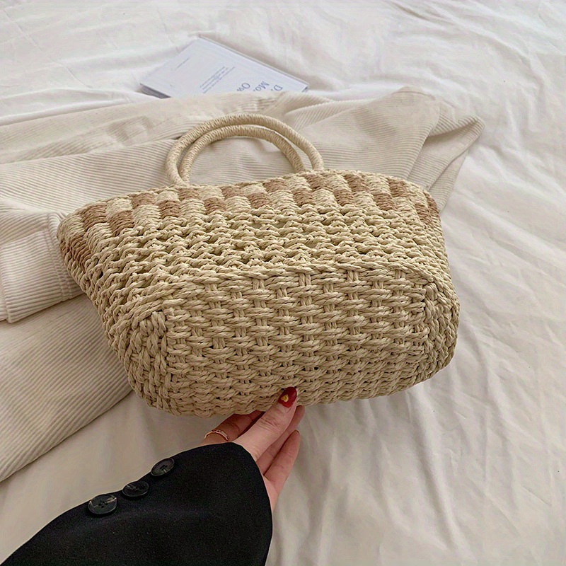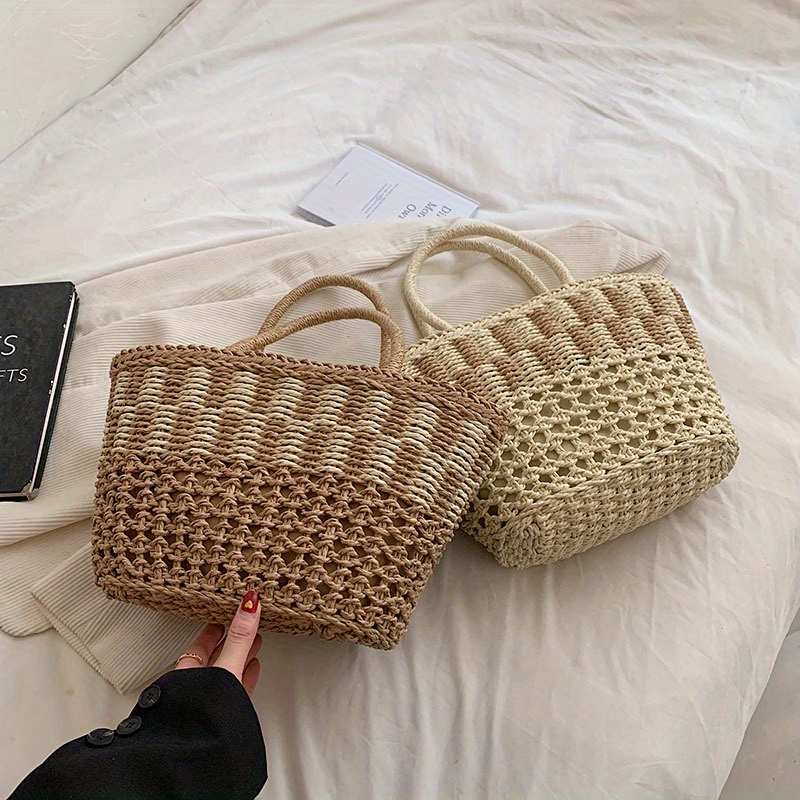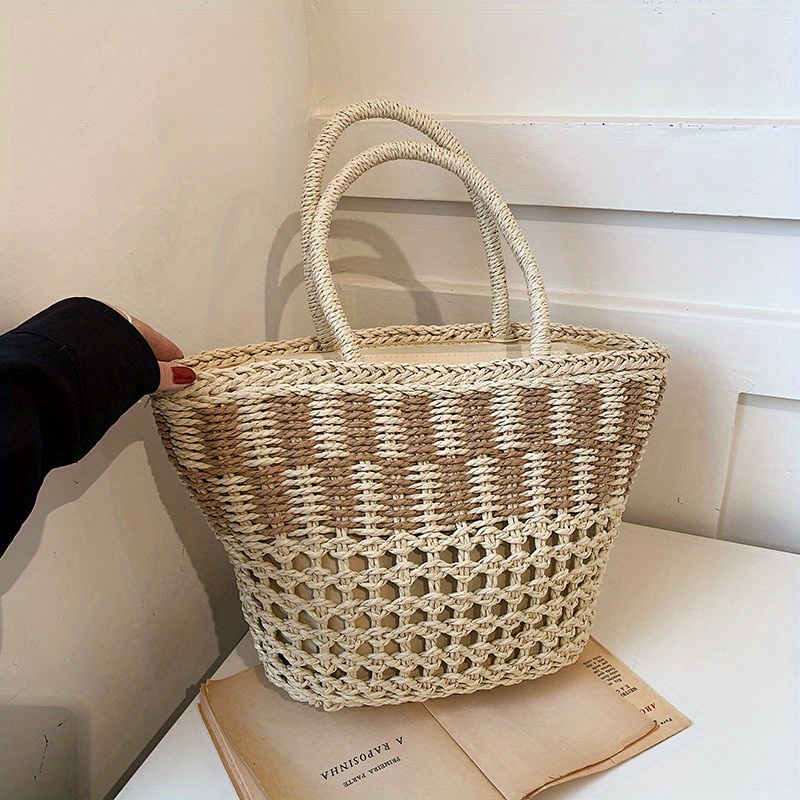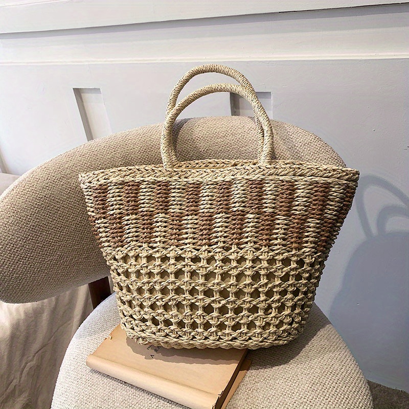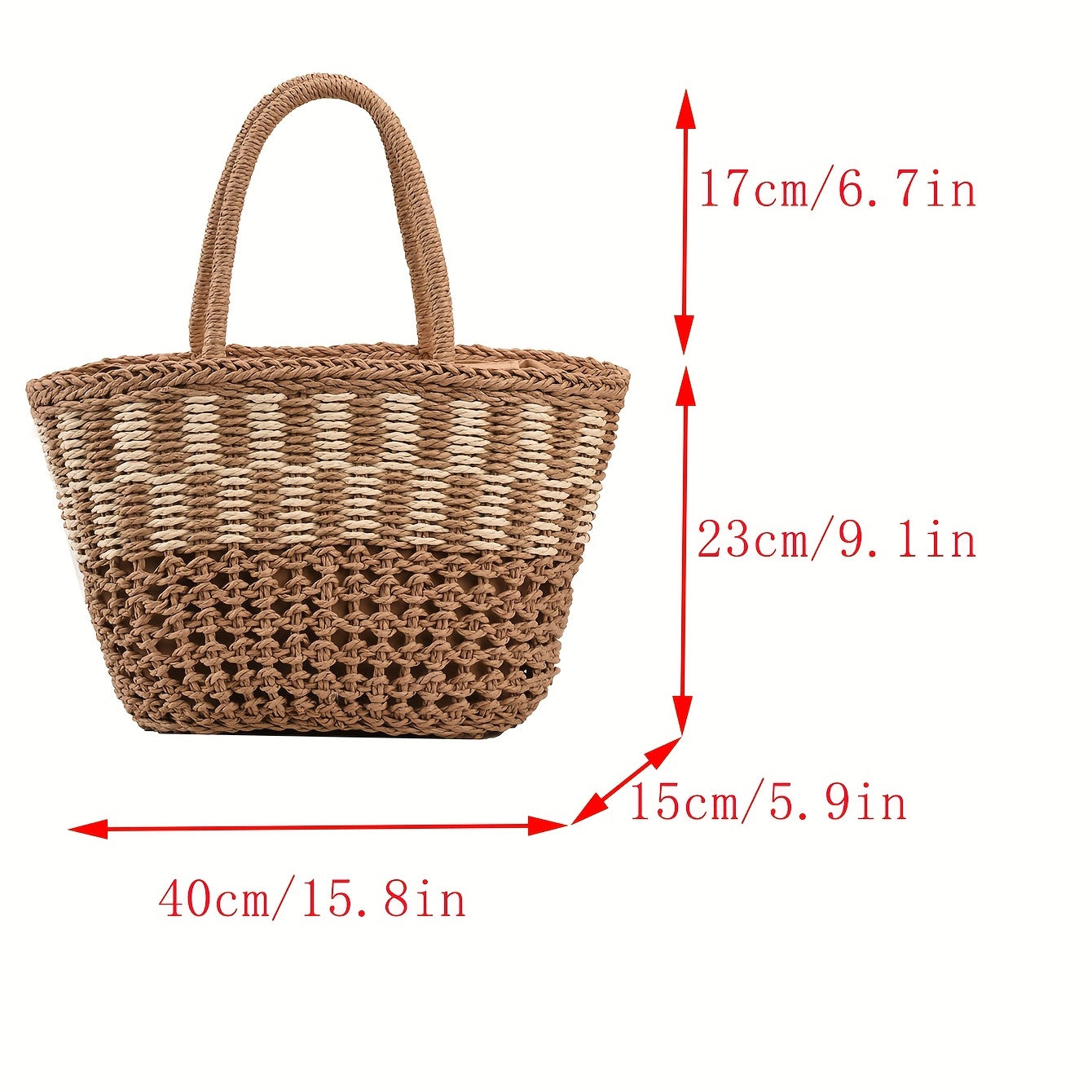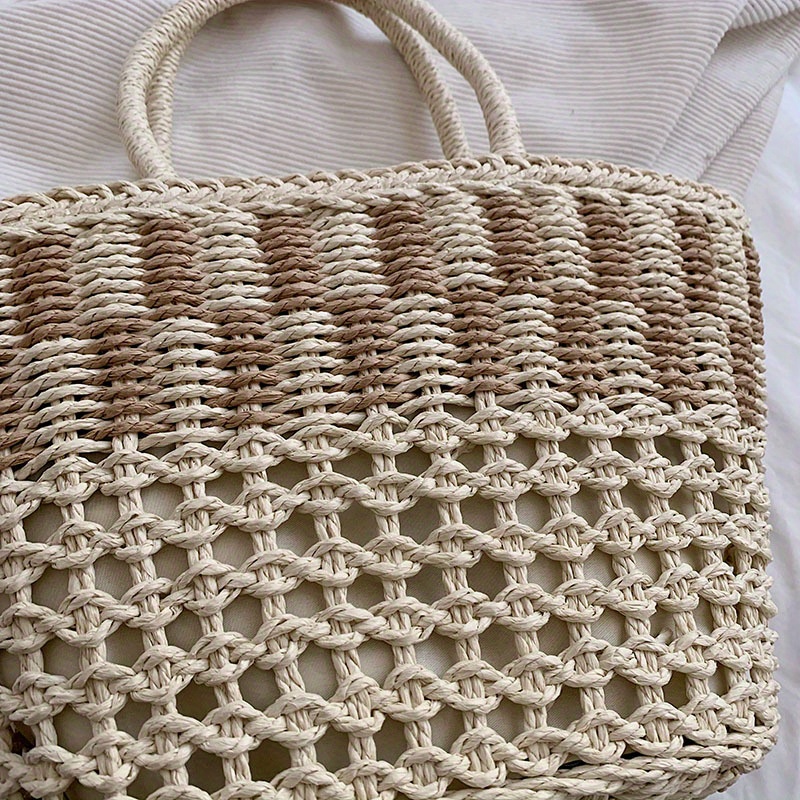 カラーブロック かご風トートサッチェル 軽量 シンプル ハンドバッグ 旅行・ビーチに使える 多用途バッグ