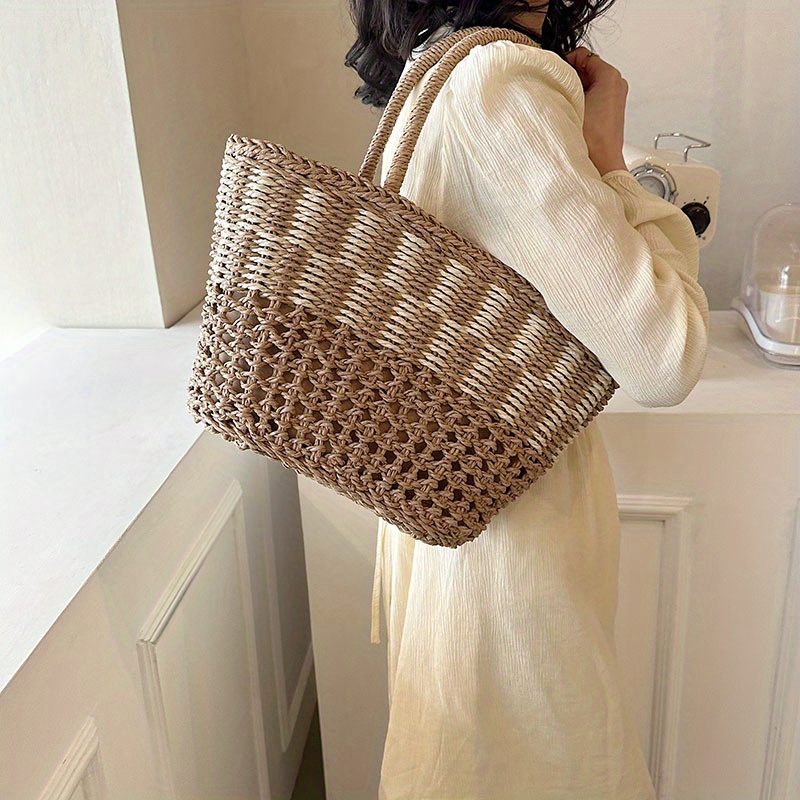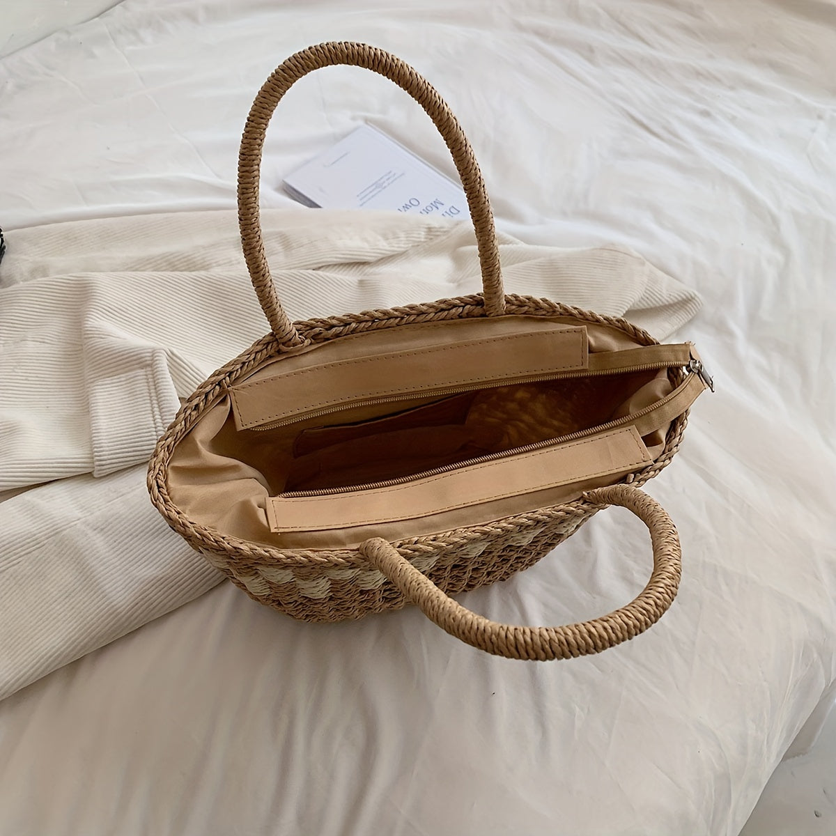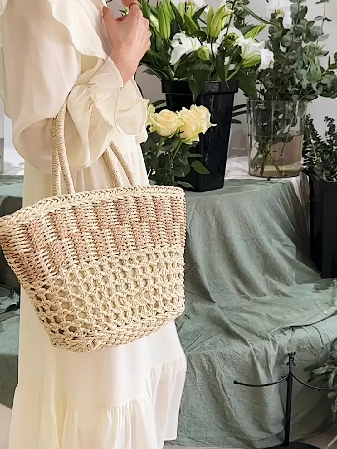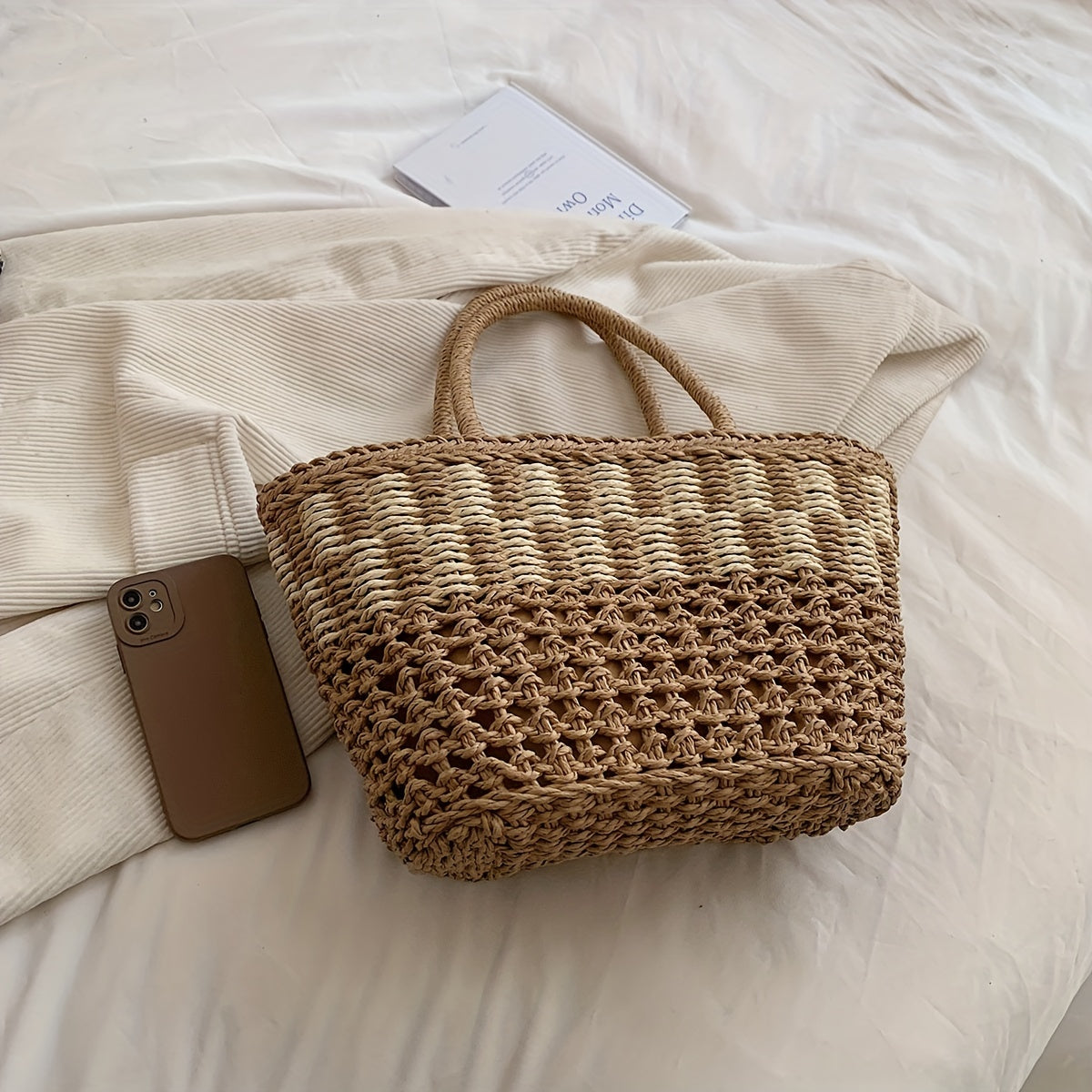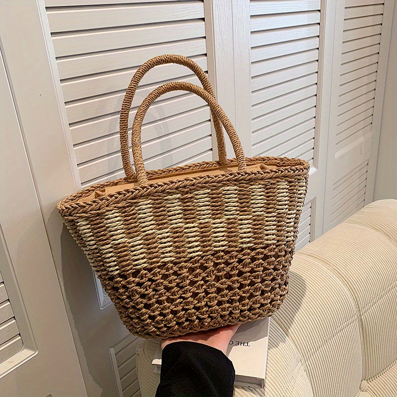 カラーブロック かご風トートサッチェル 軽量 シンプル ハンドバッグ 旅行・ビーチに使える 多用途バッグ