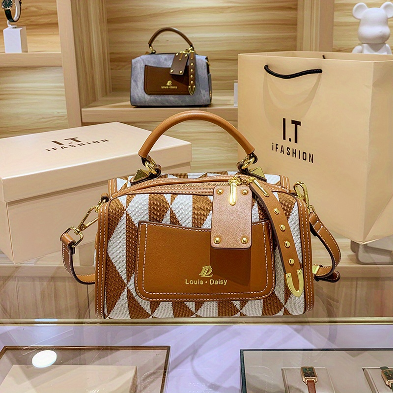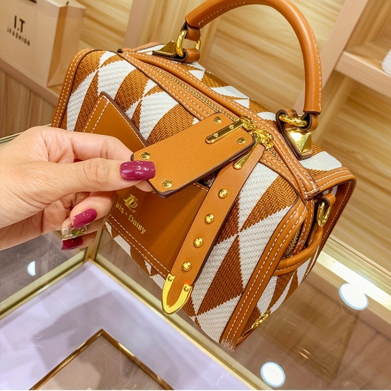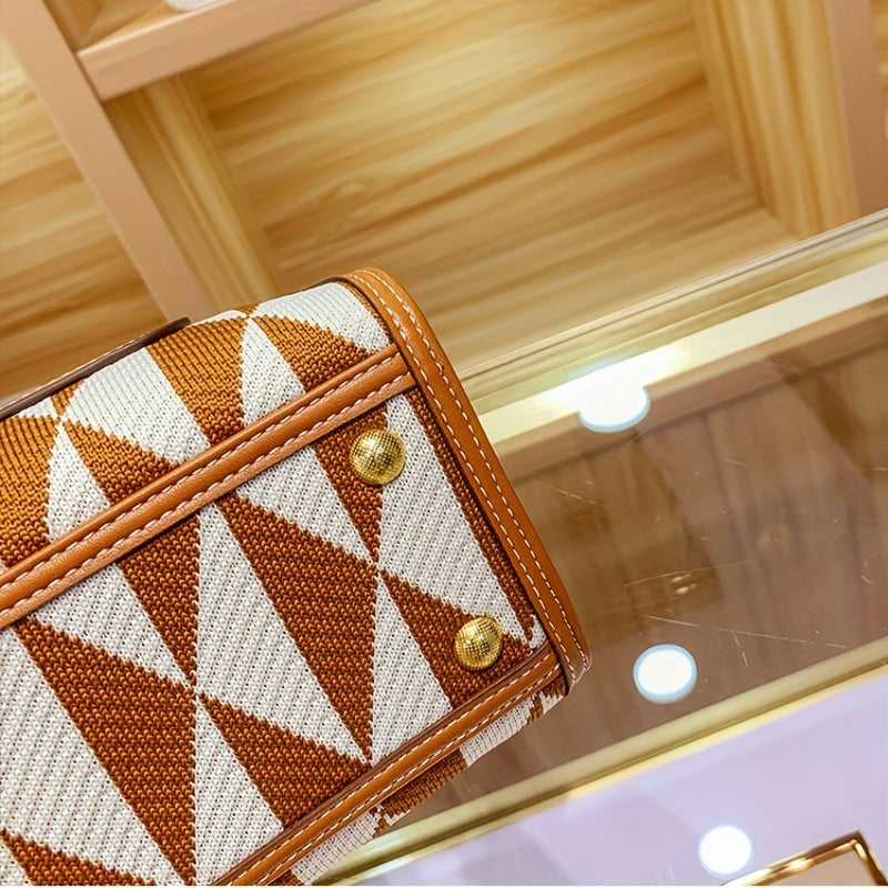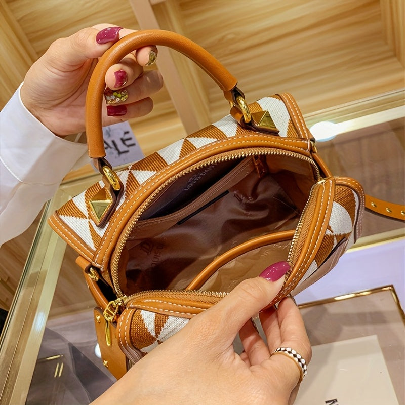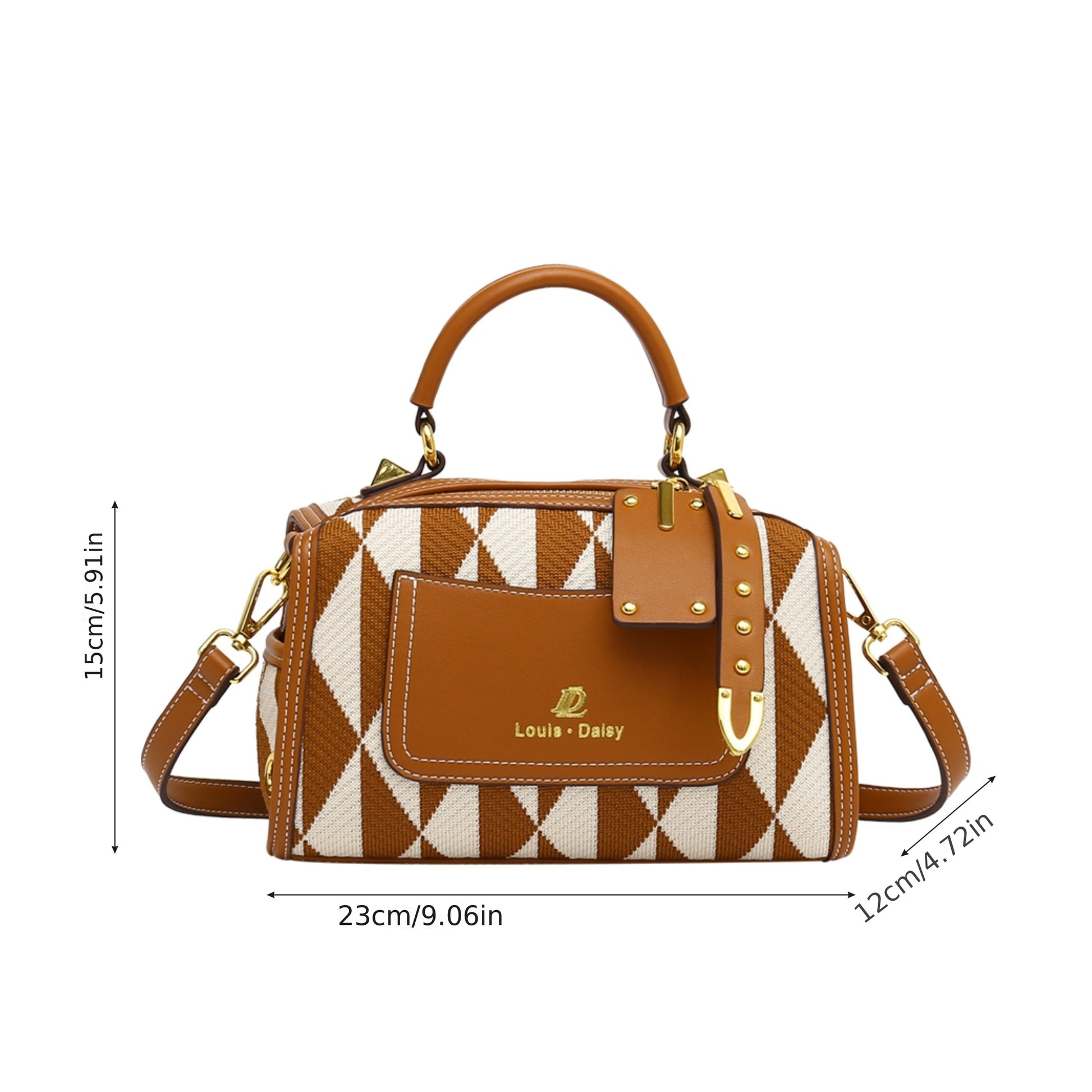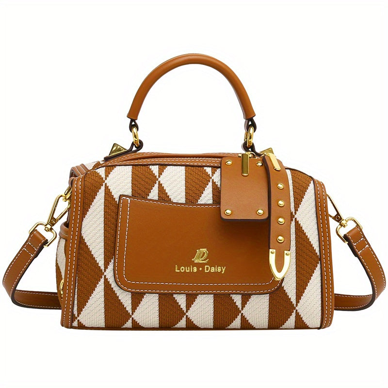 カーキ アーガイル幾何柄 カラーブロック ショルダーバッグ ファスナー付き ポータブルハンドル クロスボディ 大容量 エレガント ハンドバッグ レディース