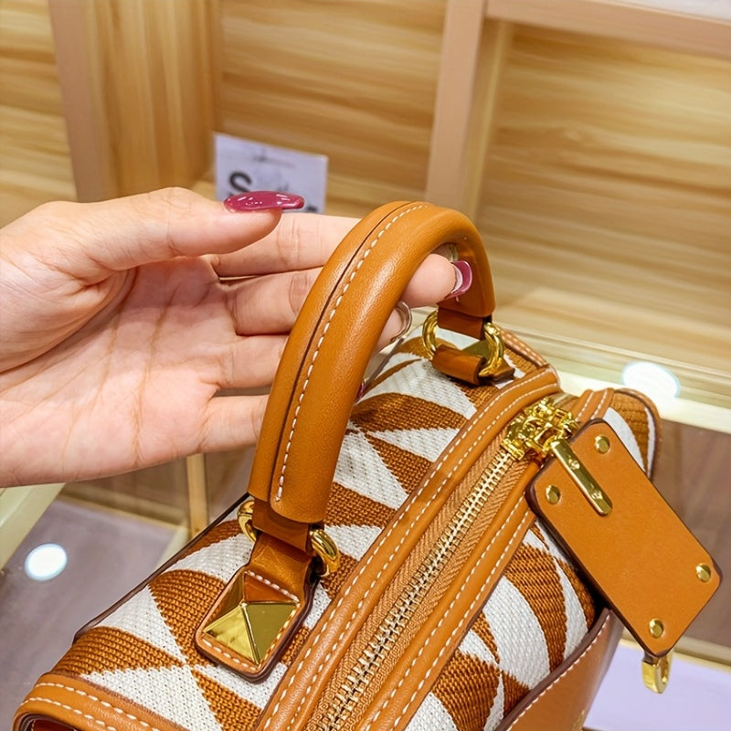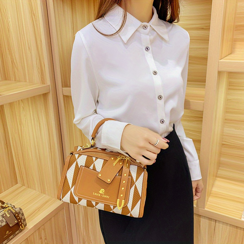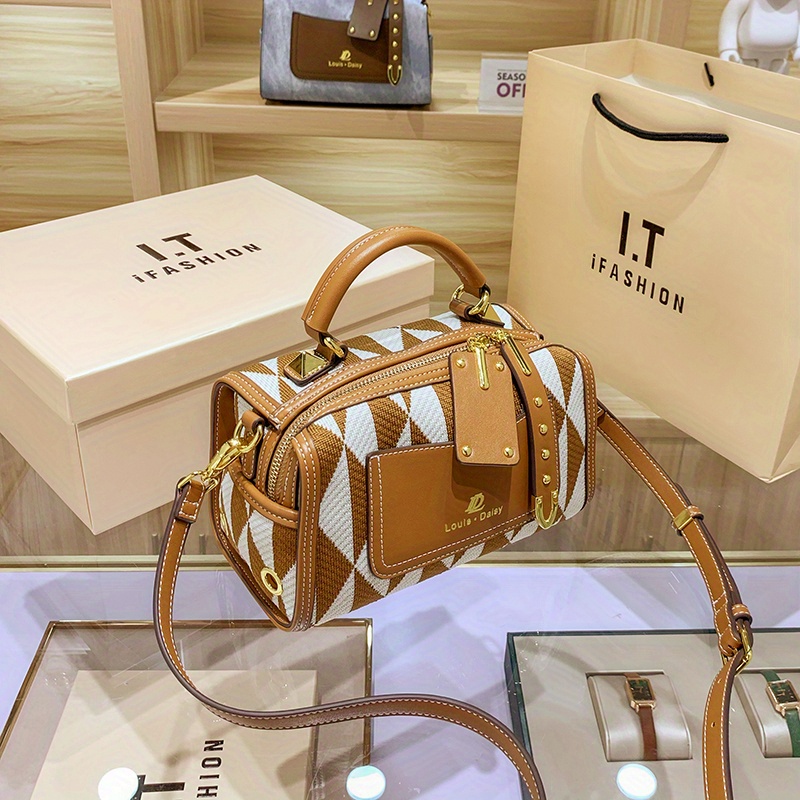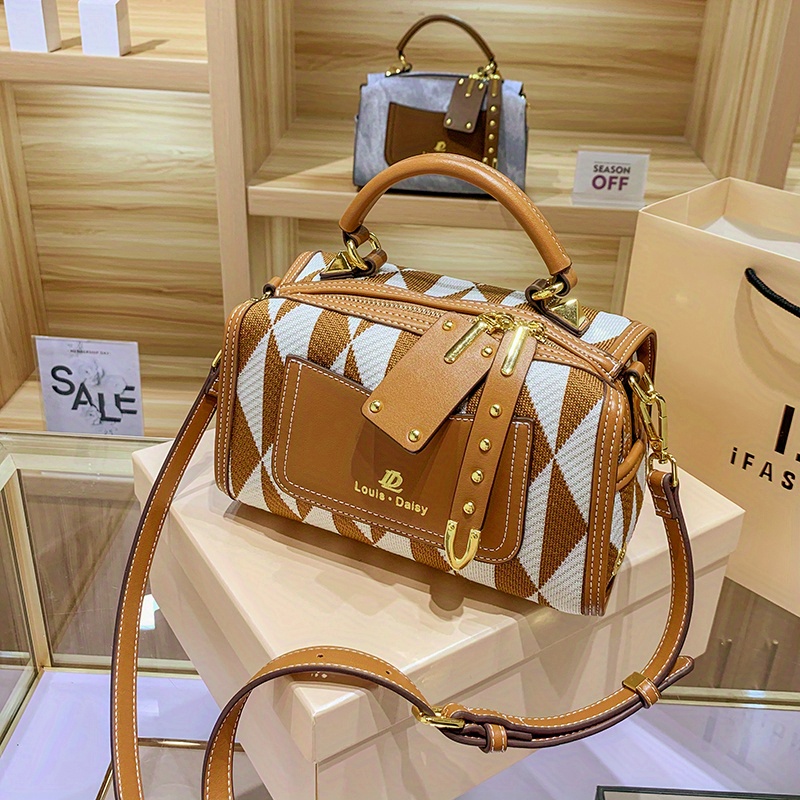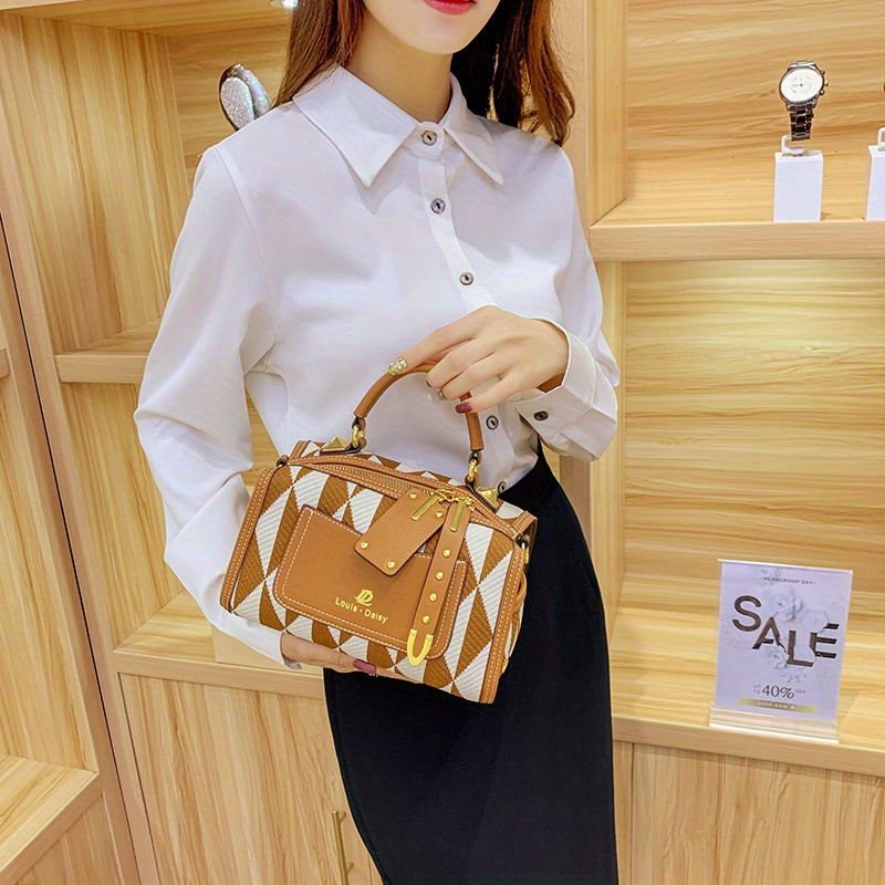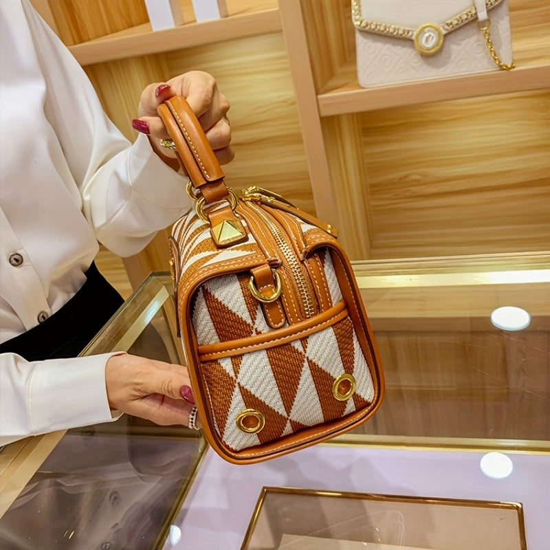 カーキ アーガイル幾何柄 カラーブロック ショルダーバッグ ファスナー付き ポータブルハンドル クロスボディ 大容量 エレガント ハンドバッグ レディース